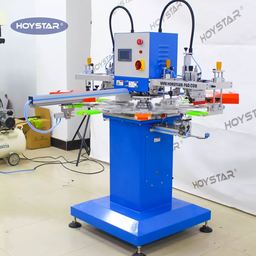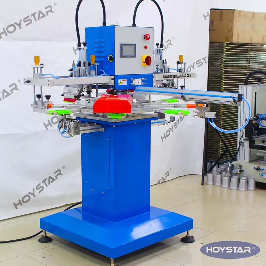 A HOYSTAR megbízható gyártó és szállító Kínában; Ez a HOYSTAR 2 színű, automata konzervhűtő Koozies szitanyomógép Az élelmiszer- és csomagolóipar számára alkalmas, konzerv- és dobozhűtőkre specializálódott. Ez az automatikus szitanyomógép zökkenőmentesen automatizálja a teljes kétoldalas nyomtatási folyamatot. A betöltéstől a nyomtatásig, szárításig, 180 fokos elforgatásig, második oldali nyomtatásig és végső kirakodásig