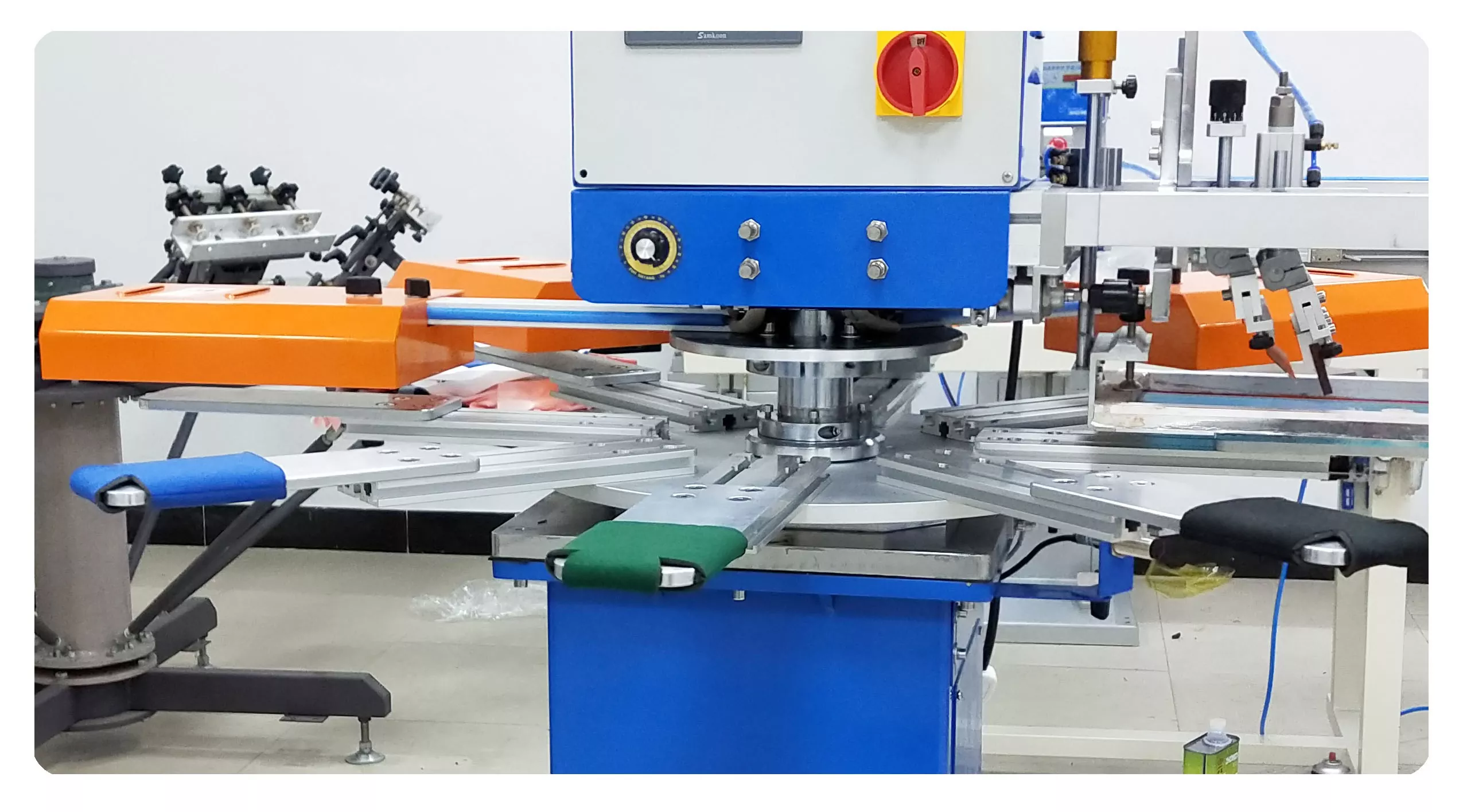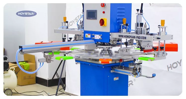 5. A forgó munkaasztal nyolc állomást tartalmaz: egy a betöltéshez, egy a nyomtatáshoz, kettő a szárításhoz és egy a kirakodáshoz, amelyek lehetővé teszik öt állomás egyidejű munkáját.