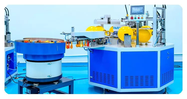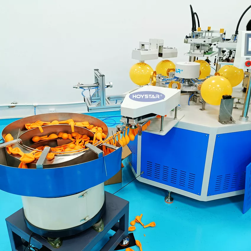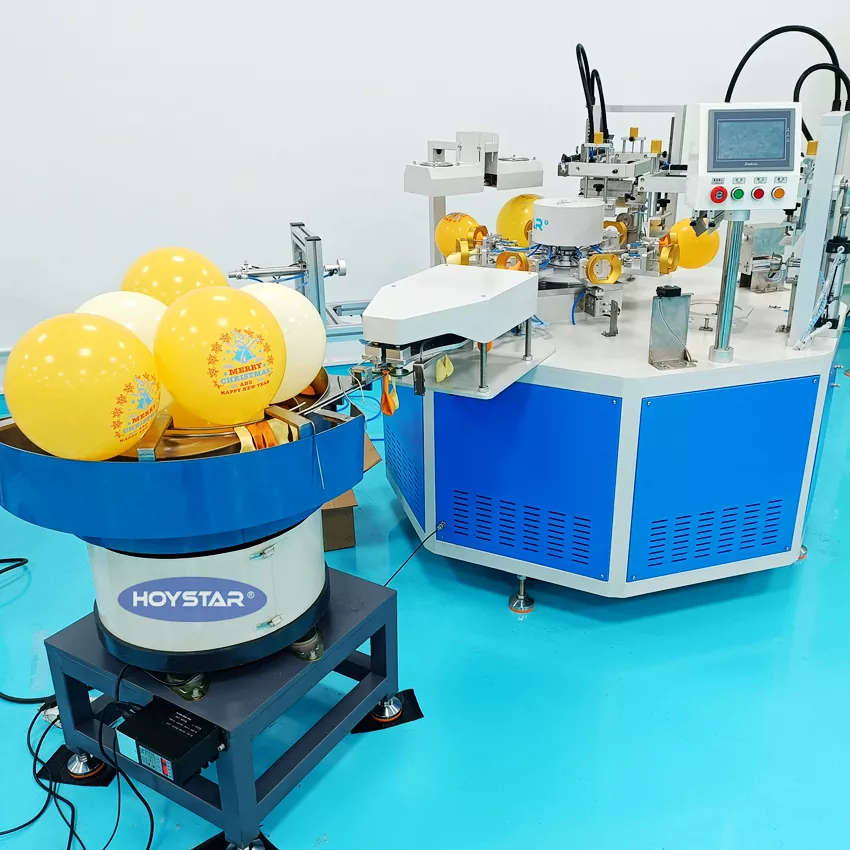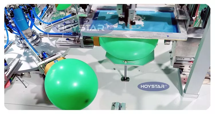 Kínai professzionális gyártóként nagy hatékonyságú HOYSTAR 2 színes léggömbök szitanyomógépet szeretnénk kínálni automatikus adagolóval. Gépeink PLC és érintőképernyős vezérlést használnak, és főként különféle típusú latex ballonok nyomtatására szolgálnak. Automata adagolóval felszerelt gép, automatikus betöltés, automatikus nyomtatás, automatikus szárítás. A 2 színben történő nyomtatás egy menetben, és a szárítószekrény is jól szárítja a tintát.
