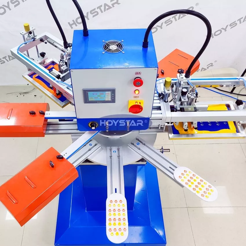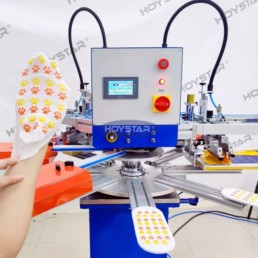 Professzionális gyártóként és beszállítóként a HOYSTAR High Rapid 2 Colors Socks szitanyomógépet a textilkötőiparban való alkalmazásokhoz tervezték. Akár 1000 DB/óra sebességével csúszásmentes zokni, baba zokni, felnőtt zokni, focizokni stb. nyomtatására alkalmas. Forgó munkaasztallal felszerelve nagyon kényelmes a zokni be- és kipakolása. PLC érintőképernyős vezérlés, nagyon könnyen kezelhető. A szárítórendszerrel felszerelt gép jól szárítja a szilíciumot és a tintát.