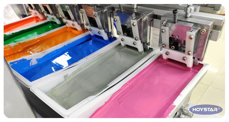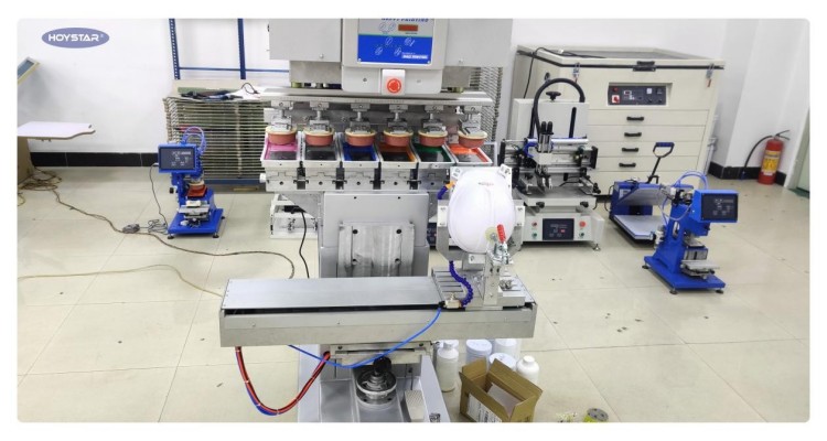 A 6 színű védősisakos tamponnyomtató gép ingalappal felszerelt, egyszerre 6 színt tud nyomtatni.
