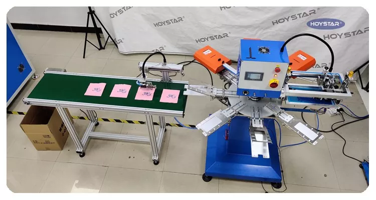 Professzionális gyártóként és beszállítóként a HOYSTAR Automatic 1 Color szalvéta szitanyomógép. kifejezetten a szalvétákra történő teljesen automatikus nyomtatáshoz készült. Áramvonalas nyomtatási folyamata a következőképpen bontakozik ki: a szalvéták manuális felhelyezése a gépre – az első szín automatikus nyomtatása – automatikus szárítás – automatikus kirakodás – és automatikus termékgyűjtés.