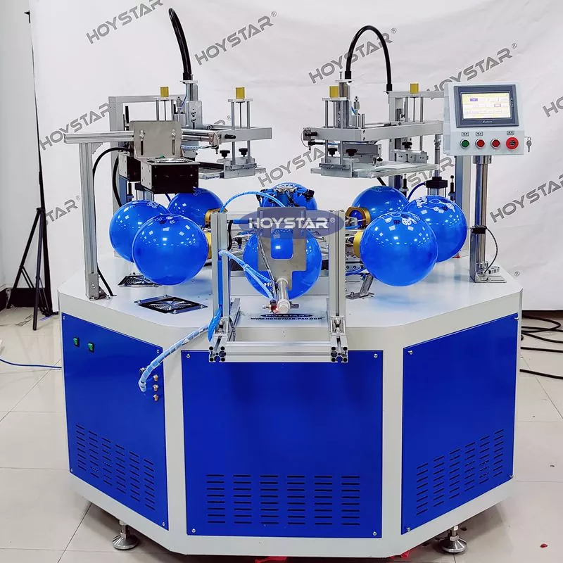 Professzionális gyártóként és beszállítóként a HOYSTAR Automatic 2 Color Balloons szitanyomógép latex léggömbökre való nyomtatásra készült. Forgó munkaasztallal, automata fúvással, automatikus forgatással, automata szárítással, automatikus kirakodási funkciókkal felszerelt. PLC érintőképernyős vezérlés, felhasználóbarát felület a biztonságos, intuitív kezelés érdekében. A gép ötvözi a sebességet, a pontosságot és a könnyű használhatóságot.