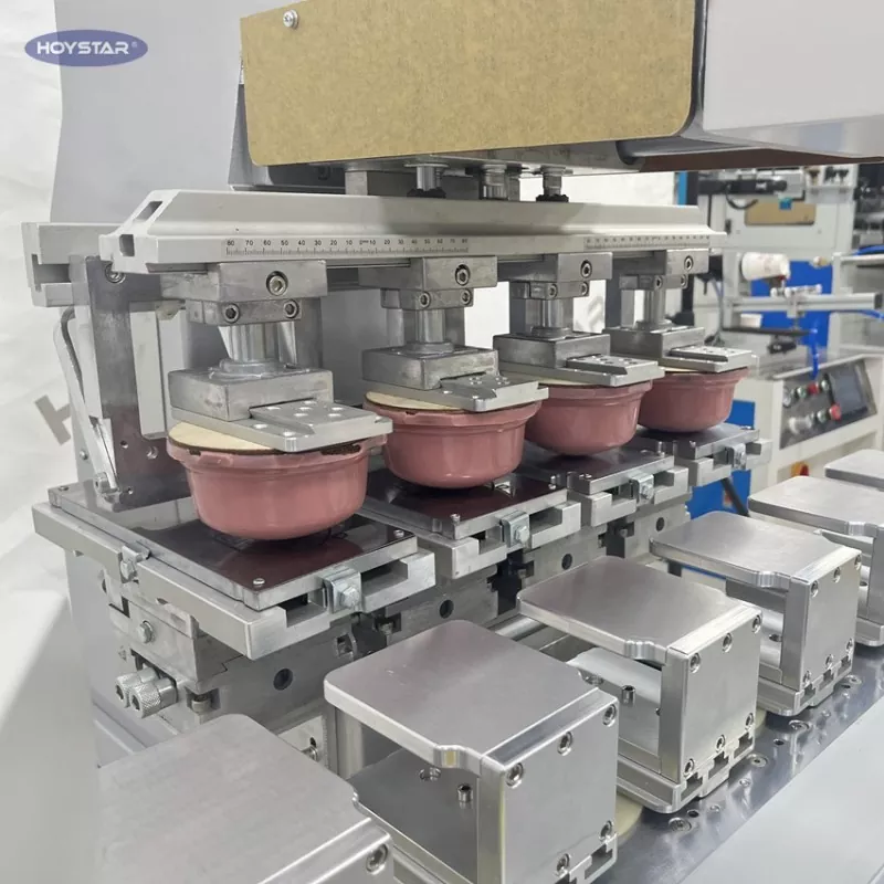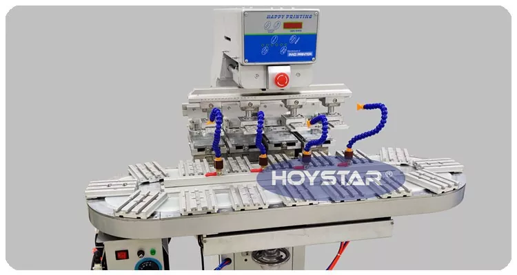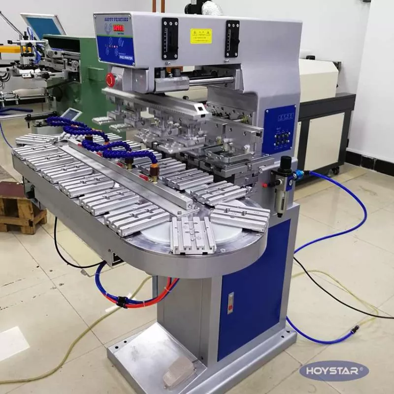 Kínai professzionális gyártóként szeretnénk Önnek nagy hatékonyságú HOYSTAR nagy méretű, négyszínű tamponnyomtatót szállítószalaggal. Ez a gép folyamatos négyszínű tamponnyomást tesz lehetővé a termékekhez, és egyetlen ciklusban képes elvégezni a színregisztrációt. Ez a gép forgó forgótányéros szállítórendszert alkalmaz, amely lehetővé teszi a folyamatos és zökkenőmentes termékátvitelt a teljes nyomtatási folyamat során, és lehetővé teszi a teljes 4 színű felülnyomást egyetlen forgási ciklusban. A shuttle típusú padnyomtatókhoz képest nagyon gyors a sebessége.
