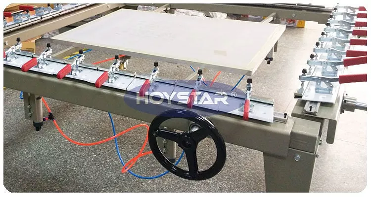 A gép összehúzhatja vagy bővítheti a szitafeszítő polcának méretét a szitaszövet és a szitakeret méretének megfelelően. Nagyon kényelmes helyzetbe hozni.