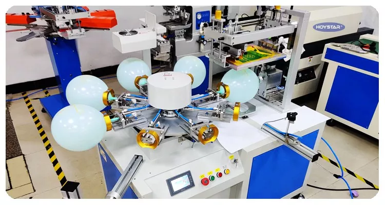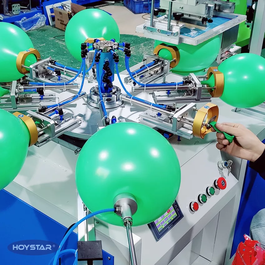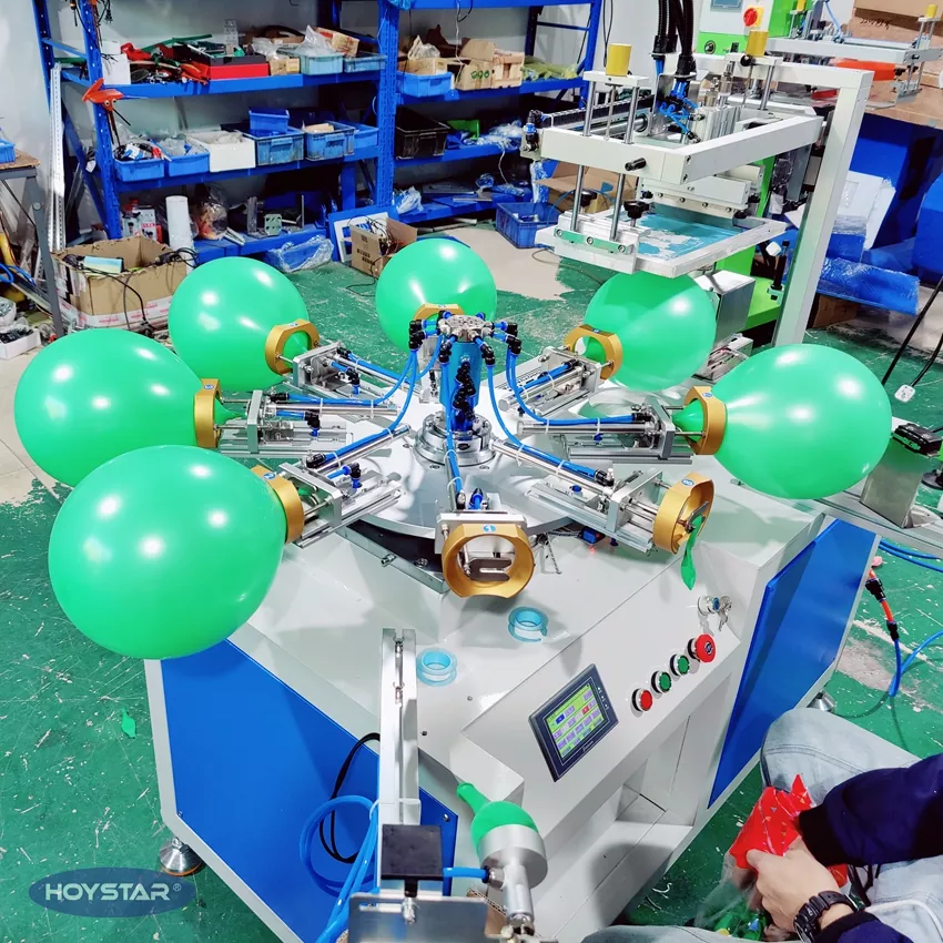 A HOYSTAR megbízható gyártó és szállító Kínában; Ezt a HOYSTAR egyszínű latex ballonos szitanyomógépet latex léggömbökre való nyomtatáshoz tervezték. Forgó munkaasztallal, automata fúvással, automatikus forgatással, automata szárítással, automatikus kirakodási funkciókkal felszerelt. PLC érintőképernyős vezérlés, felhasználóbarát felület a biztonságos, intuitív kezelés érdekében. A gép ötvözi a sebességet, a pontosságot és a könnyű használhatóságot.
